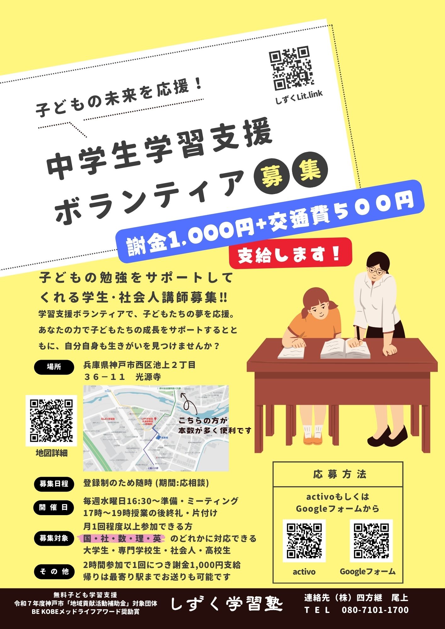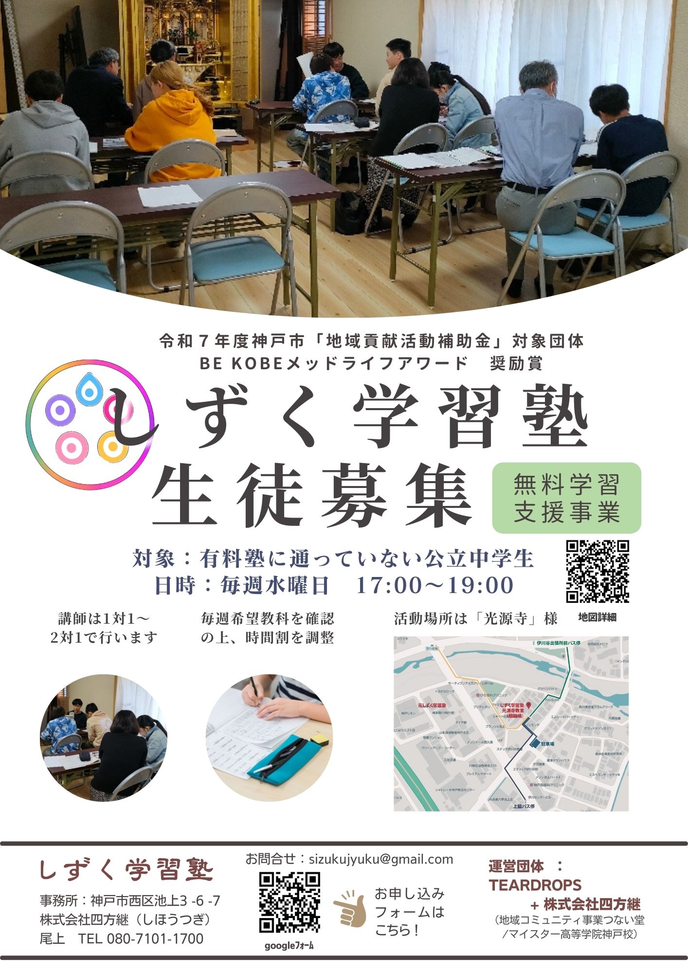 2024年に開校した「しずく学習塾」。学びたい!の気持ちを持った中学生の皆さんが参加してくれています。一年生は中学に入って急に難しくなった勉強に戸惑いがち。三年生は受験に向けて頑張って学んでいます。随時問い合わせを受け付けておりますので気になる方はこちらをご覧下さい。ボランティアで参加して下さる方も申し込み受付中ですのでお申し込み、お問合せ下さい。