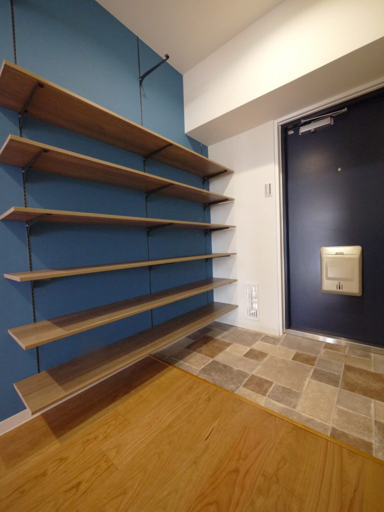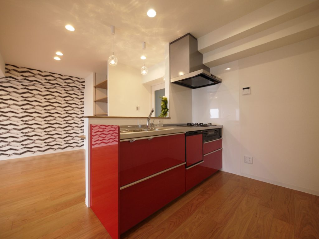 キッチンの位置を変えたので、キッチン背面に家電収納、食器棚、冷蔵庫が並びます。使いやすい並びです。