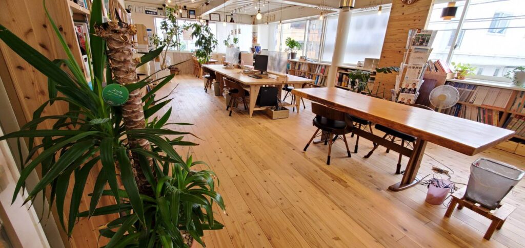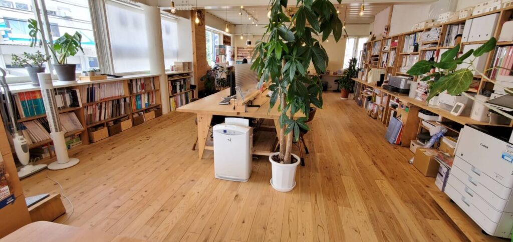 事務所スペースと打ち合わせ室、2つに分かれていた部屋は1つのオープンなスペースとなり、土足で冷え込んでいた足元は断熱材を施工し、邪魔になっていた配線も床下へ、仕上には屋久島産の杉無垢板のフローリングが貼られていました。棚やテーブルも手作りで何とも言えない木の香しい香りがしています。